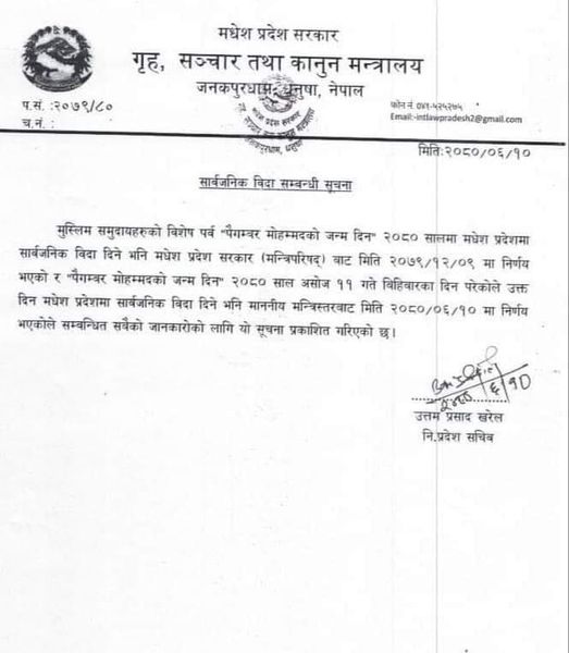 मुस्लिम समुदायको महान पर्व ‘‘पैगम्बर महोम्मदको जन्मदिन – २०८०’’को अवसरमा भोलि विहिवारका दिन विदा दिएको मधेश प्रदेश सरकारको गृह, सञ्चार तथा कानुन मन्त्रालयका नि. प्रदेश सचिव उत्तम प्रसाद खरेलले जानकारी दिए ।